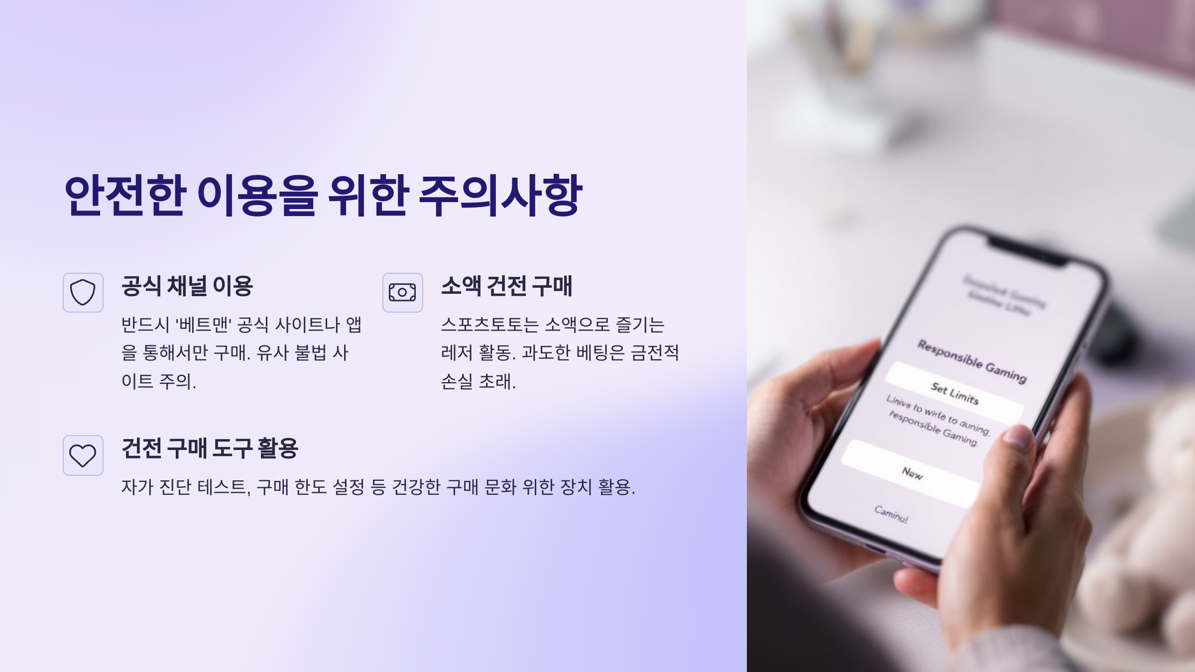 베트맨 모바일 구매는 편리함이라는 큰 장점을 제공하지만, 몇 가지 유의사항을 숙지하고 건전하게 이용하는 자세가 필요합니다. 먼저, 반드시 합법적인 운영 주체인 '베트맨' 공식 사이트 또는 앱을 통해서만 구매해야 합니다. 유사한 이름의 불법 스포츠 도박 사이트들이 성행하고 있으므로, 접속 주소를 정확히 확인하고 피싱이나 사기 피해에 각별히 주의해야 합니다. 불법 사이트 이용은 법적 처벌 대상이 될 수 있으며, 금전적 피해를 보상받기 어렵습니다. 또한, 스포츠토토는 소액으로 건전하게 즐기는 레저 활동임을 명심해야 합니다. 과도한 금액을 베팅하거나 무리하게 참여하는 것은 금전적 손실은 물론 일상생활에 부정적인 영향을 미칠 수 있습니다. 베트맨 사이트 내에는 건전 구매 캠페인, 자가 진단 테스트, 구매 한도 설정 등 건강한 구매 문화를 위한 장치들이 마련되어 있으므로, 이를 적극적으로 활용하는 것이 좋습니다. 편리한 모바일 구매를 통해 스포츠 관람의 재미를 더하되, 항상 책임감 있는 자세로 건전하게 즐기는 것이 중요합니다.